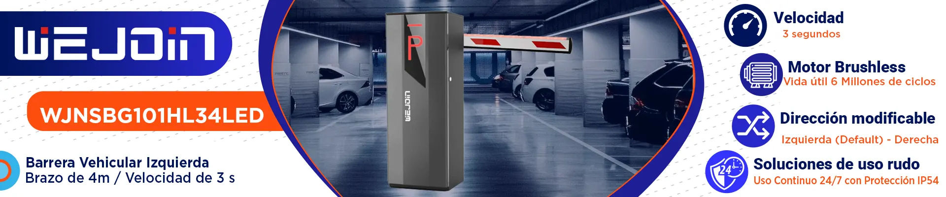 La barrera vehicular WJNSBG101HL34LED combina innovación, rendimiento y durabilidad. Su brazo de 4 metros con iluminación LED garantiza visibilidad y seguridad. Gracias a su motor sin resortes, ofrece una operación ágil en solo 3 segundos, ideal para zonas de tráfico medio-alto donde se necesita un flujo más ágil de vehículos, con una vida útil de hasta 6 millones de ciclos. Su diseño versátil permite ajustar fácilmente la dirección de apertura, adaptándose a tus necesidades de instalación.
